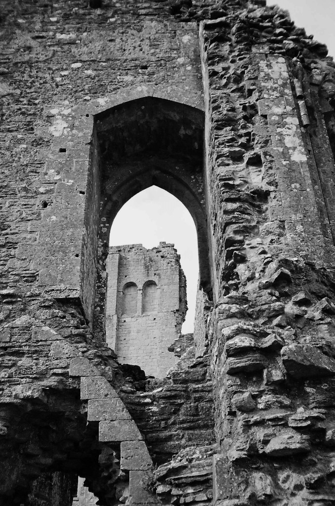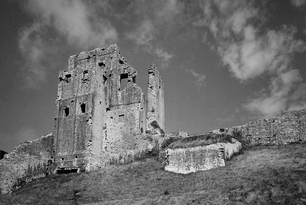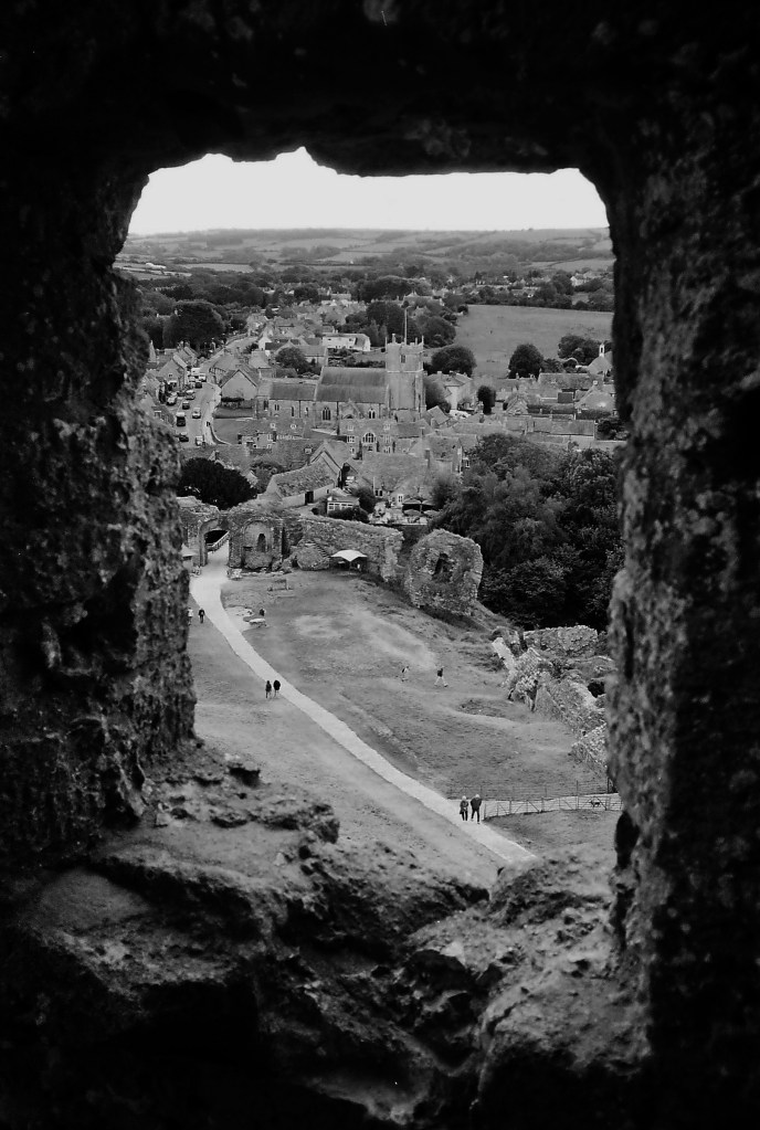 Corfe Castle takes it’s name from the old English “ceorfan” which means cutting. This must be because the castle is built in the only natural break (cutting) in a ridge, and therefore offers great natural defence. Before the castle it is thought that there was a Saxon Hall on the site, and postholes have been found. It is believed that Queen Ælfthryth, wife of Edgar, (The first to be crowned King of “all of England”) used this as Royal residence, and it might have also been where where the boy-king Edward the Martyr was assassinated in 978. The Keep in the image above dates from the 12th century.