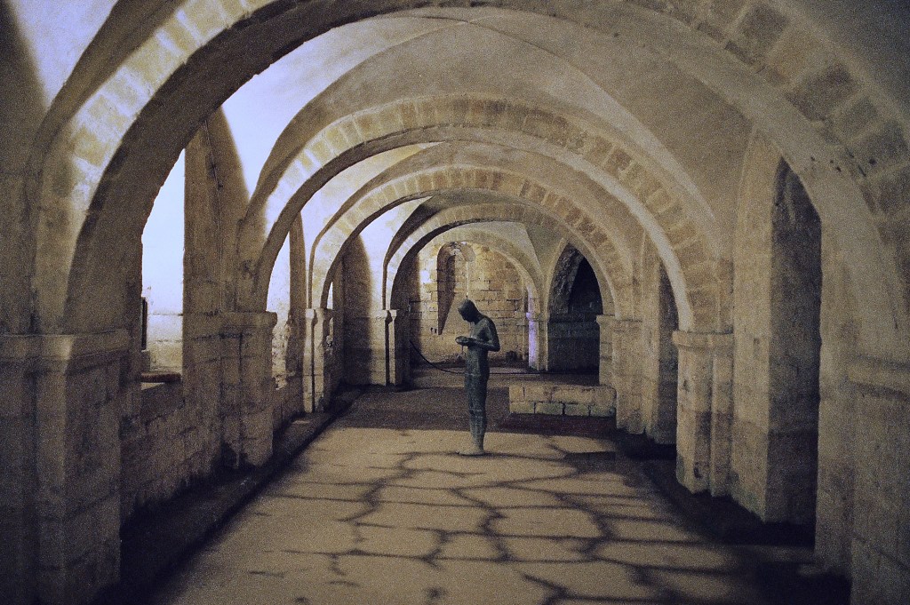 Exiting here to the left, tucked under some stairs we can visit the Norman vaulted crypt. There has been a statue by the artist Antony Gormley here since the 80’s. The crypt often floods and the statue then is joined by it’s refection. I find it very beautiful.