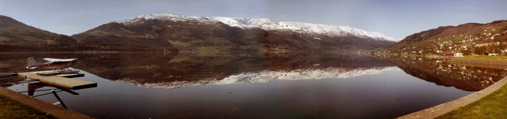 The panoramic above was exposed back in 1993, I think. I stopped off very briefly in Voss in Norway. With me I had my Samsung AF Slim compact camera loaded with Kodak Gold 200asa. As soon as I saw the view, I did what seemed the natural thing – clicked away. I made 5 images, working left to right. I can’t remember how I thought I’d put them together, I suspect that I may have had a PC by then, and I might have had a basic version of photoshop too. I seem to remember “PhotoDeluxe” by Adobe. Any one else have any memories of that? I think it was what came before Photoshop Elements. Anyway, before that I had physically trimmed and stuck photo’s together with glue! I finally got around to stitching these together this week after scanning them. Only 29 years to compile!