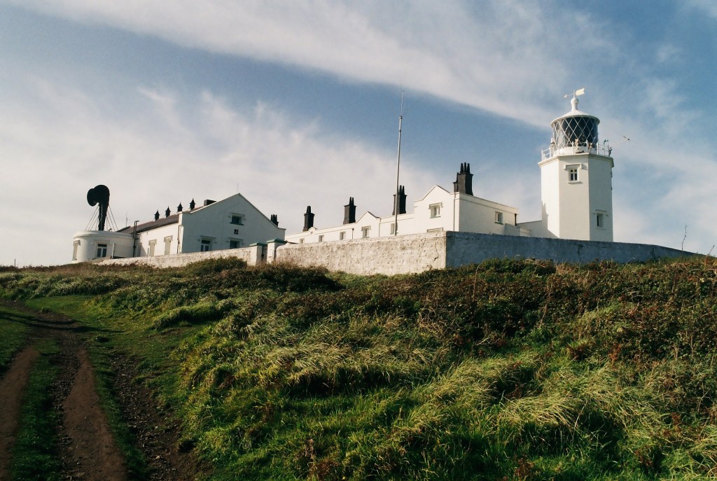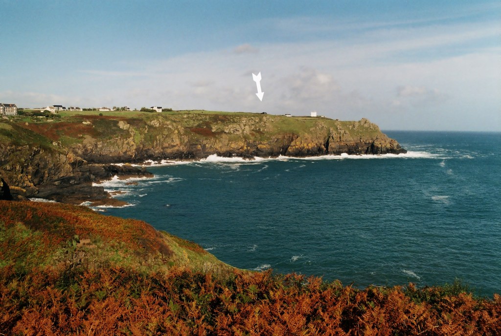 The Lighthouse stands 19 meters tall, and on a clear night, has a beam that can be seen nearly 100 miles away! Turning about 180 degrees, but from the same spot, one gets the view below. The arrow points to a small black hut, that is now the Lizard Marconi Wireless Station and Museum also run by the NT. It was here that Marconi received radio signals from a similar of his huts from Niton on the Isle of Wight, 186 miles away!