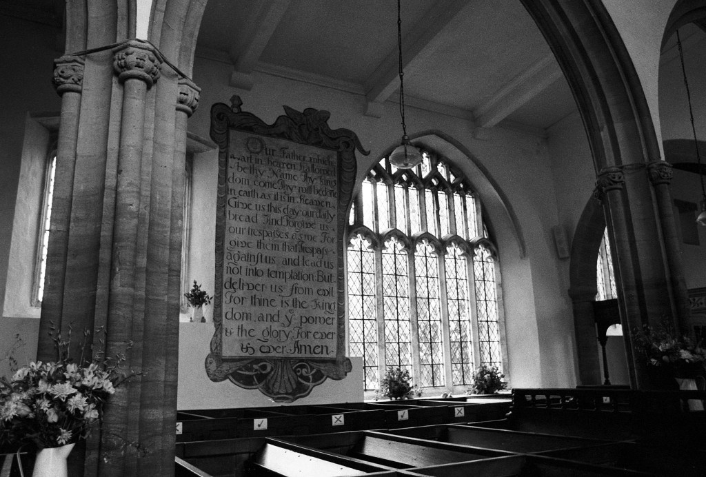 The opposite wall carries another painting, that of the Lords Prayer. The window to it’s right, has been restored to it’s original length having once had it’s sill raised to prevent a possibly bored congregation looking out of the window!
