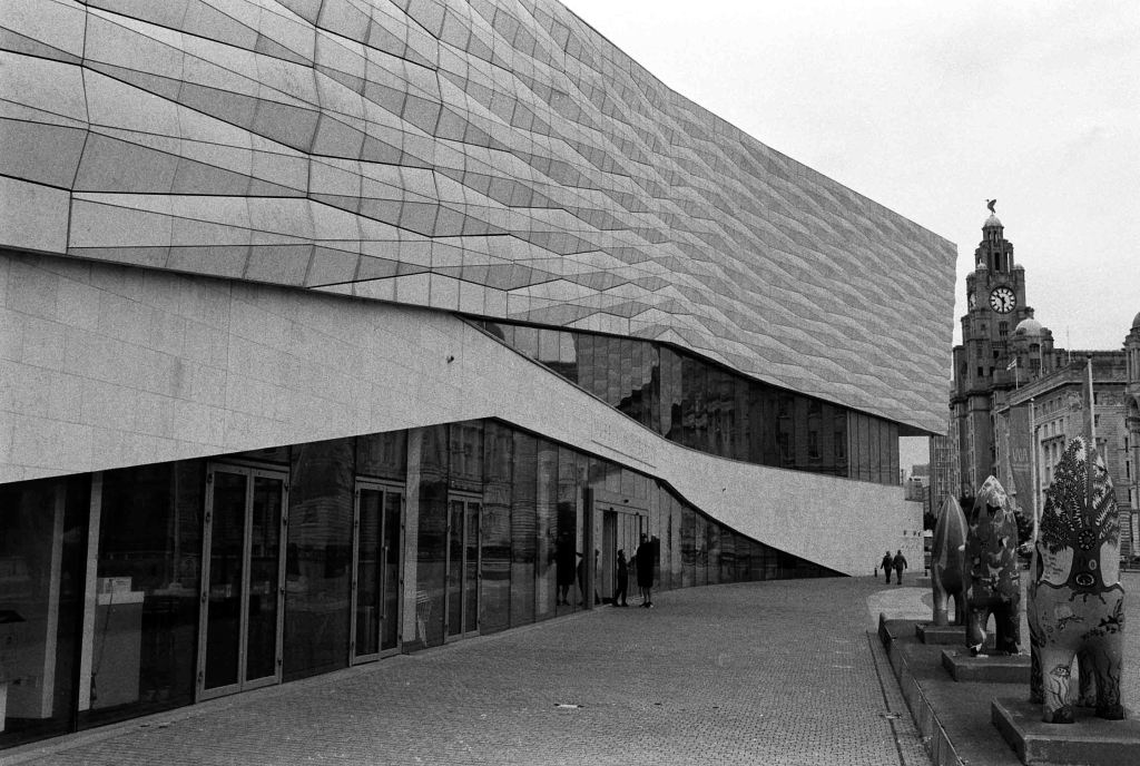 Although the weather wasn’t as good as it could have been, in fact I got very wet later in the day – I still enjoyed wandering Liverpool very much. While this post concentrates on the waterfront, there is lots more to see! All these photo’s were made on Ilford Delta 400, with my Nikon F3 and the 35mm f2. Processed in Ilford DDX 1+4 at 20°. This combination of camera and lens seems to fit my photography perfectly at the moment. Below is the Museum of Liverpool, which is ultra modern, as are some of the other buildings, personally I loved the blend!