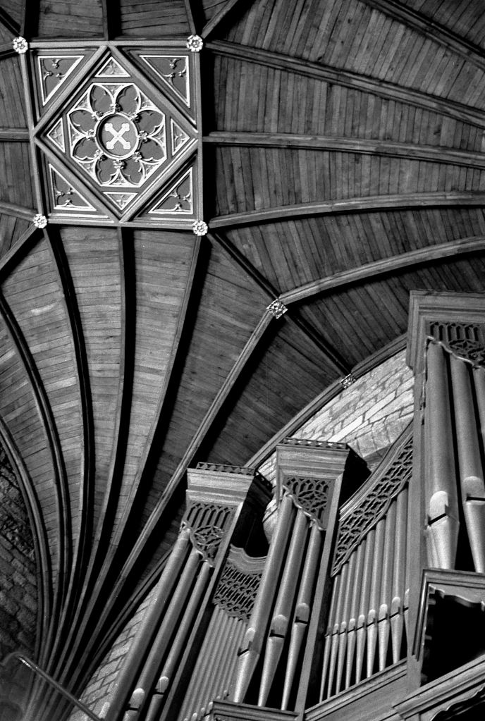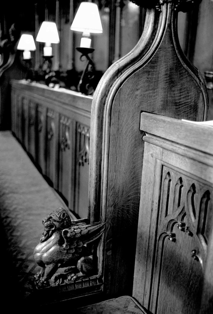 Having visited Chester Cathedral, then Liverpool Cathedral, (biggest in the UK) I couldn’t miss the opportunity to see St Asaph, the smallest in the UK. It couldn’t have been easier! Two minutes off the main road, carpark right next door with plenty of space. Out came the Nikon F3, 35mm f2 attached – of course my usual “cathedral film” Ilford XP2 and in I went!