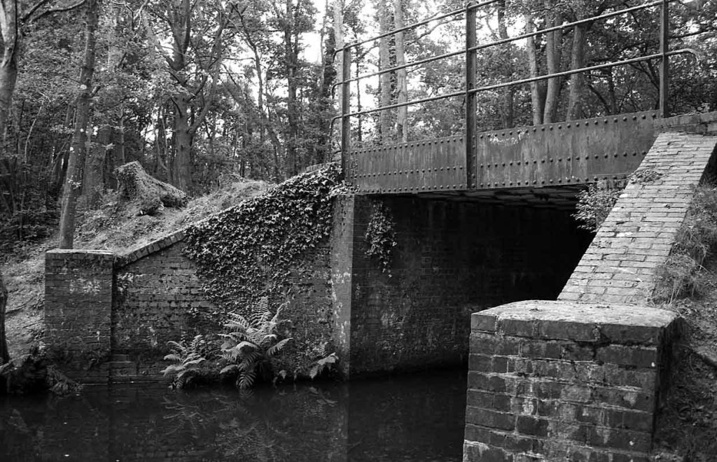 The walk here is shaded by trees, so a pleasant walk even on a hot day. It is on the flight path from Southampton airport, so every now and again there is a roar as a reasonably low flying plane passes overhead. Eventually there is a quite typical, steam era bridge over a small stream. I clambered down off the path to make a photo.