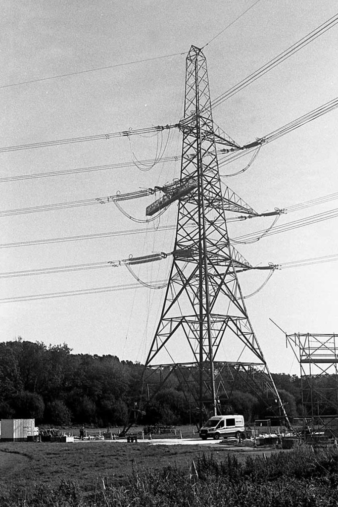 I recently shot a roll of Kodak Tri-X, to the best of my knowledge it’s the first roll I’ve used. I took a walk at the West Moors Country Park. It’s a good place for a walk especially if it’s been raining a bit, as the paths are all tarmacked. Just at the entrance to the park the electricity pylon was being worked on – not a job I’d enjoy!