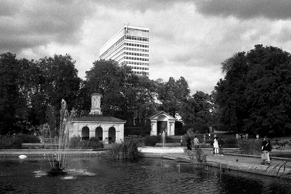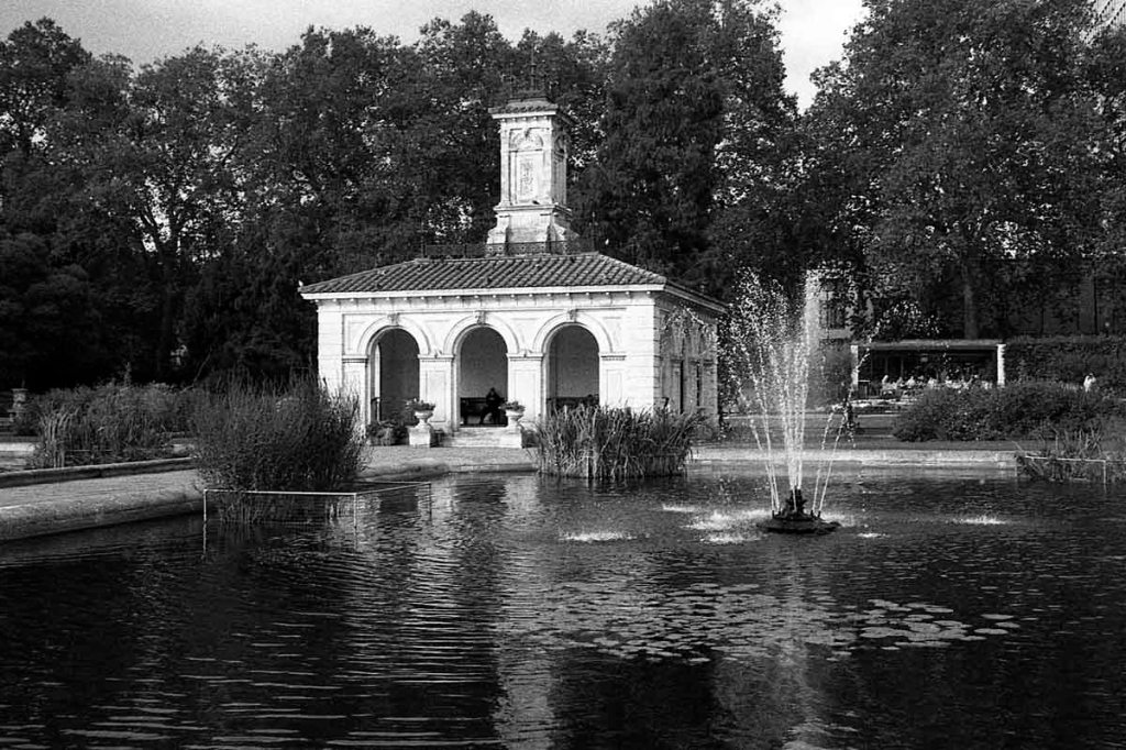 The arch above is by Sir Henry Moore and stands in Hyde Park. From this view it looks across to Kensington Gardens. You might just make out Kensington Palace in the far distance. The Italian Gardens below are in Kensington Gardens, but the boundary between them and Hyde Park seems invisible, maybe divided by the “Long Water/Serpentine”?