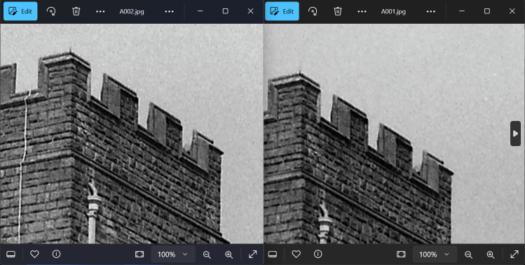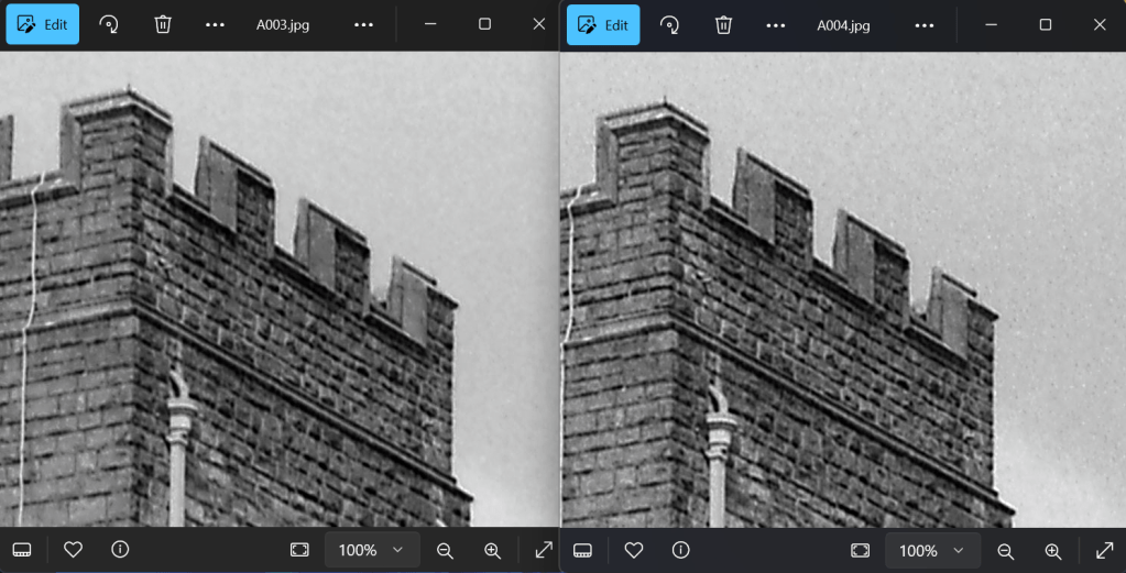 I’ve stared at both and I’m not sure I can see much difference in sharpness between either, the D23 (right) may have a slight tiny bit more, certainly nothing major. The FX55 seems to win hands down in the grain department. These are from the very same roll of film! Compare this to the Rodinal tests: