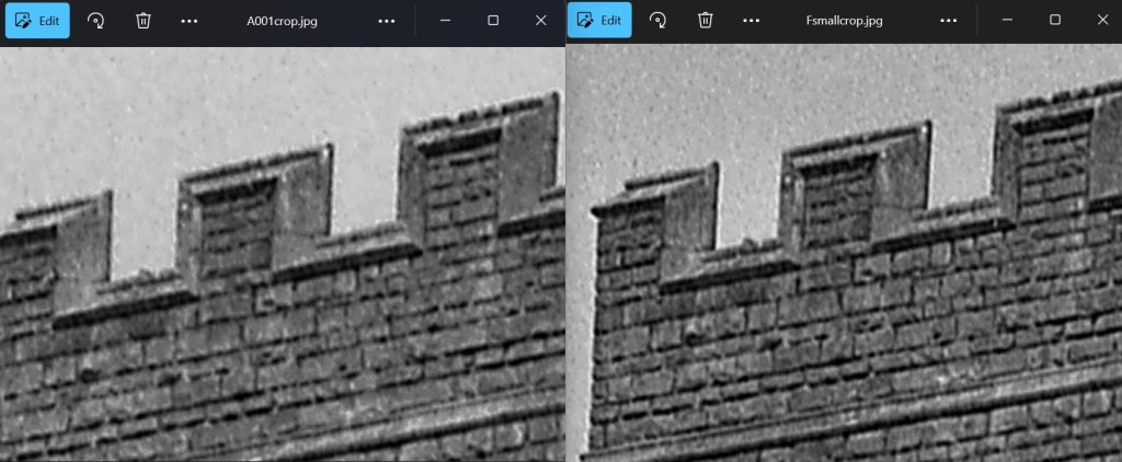 Treated exactly the same in the scanning process of course. Negs on the light box look about the same but when magnified like the above, one can see the grain. I suppose it’s true that the tiny bit of the negative above would be like printing the whole neg something like 16×20 inches, (too big for 35mm anyway?). An 8×10 may be fine. That said, better results at 1+50, shorter time stood at the sink – if I use Rodinal again – it’ll be 1+50 !!!