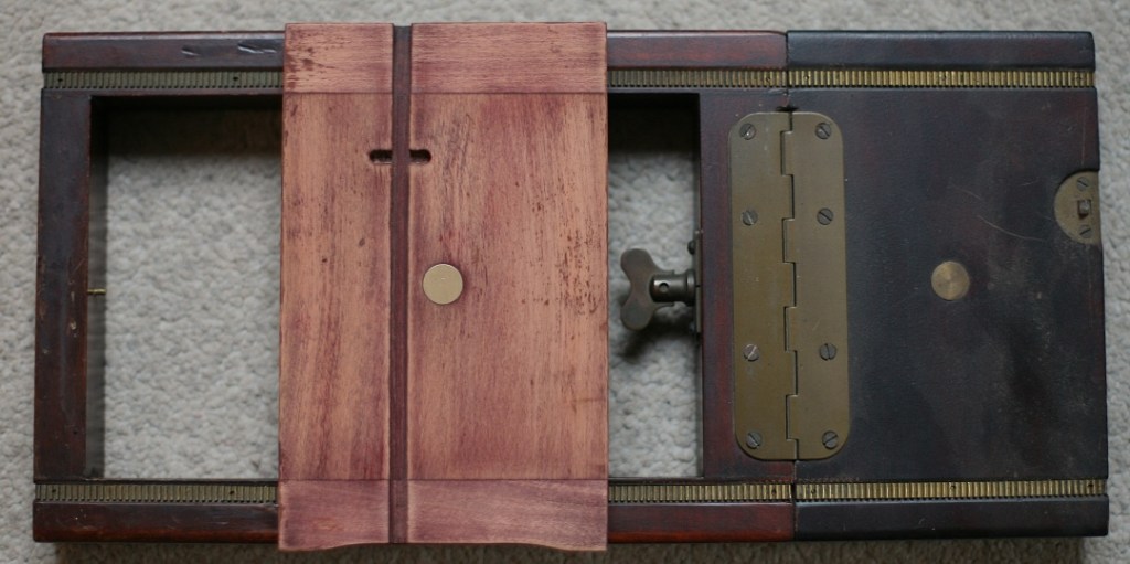 I’ve made a start on my restoration project! I removed the baseplate from the camera and the brass attached to it. I painted on a coating of paint stripper I found in the garage, wrapped it up and left it for am hour. That I could see, it did nothing! So I made my own! Basically about 500ml of water, 2 table spoons of cornflour to thicken, then 50g or thereabouts of Sodium Hydroxide. Now before I go any further, I should say – Sodium Hydroxide is nasty stuff, it’s caustic, it WILL burn your skin, so if ever you fancy making up a batch, wear all protection equipment you can, certainly glasses and gloves at the least! I repeated the procedure but only left it on for half hour or so – I knew it would work better as the colour started to come off on the brush I was painting it on with! It did OK. I washed it off, wiped and scraped and got a lot of gunk off. Since then I’ve been sanding in short bursts. It appears the original stain has gone well into the wood, so I’m not going down to bare “light” wood. What you see above is around my limit of patience! I’ve laid the sanded baseplate on the rail bed just to show the change in tone. I’m now going to select a wood dye to take it back down again, and hopefully enhance the grain and produce a lighter, but uniform look. Lesson learned here, next piece I’m going to let the stripper take more of the strain and do it’s stuff, before I clean and sand (hopefully less!).