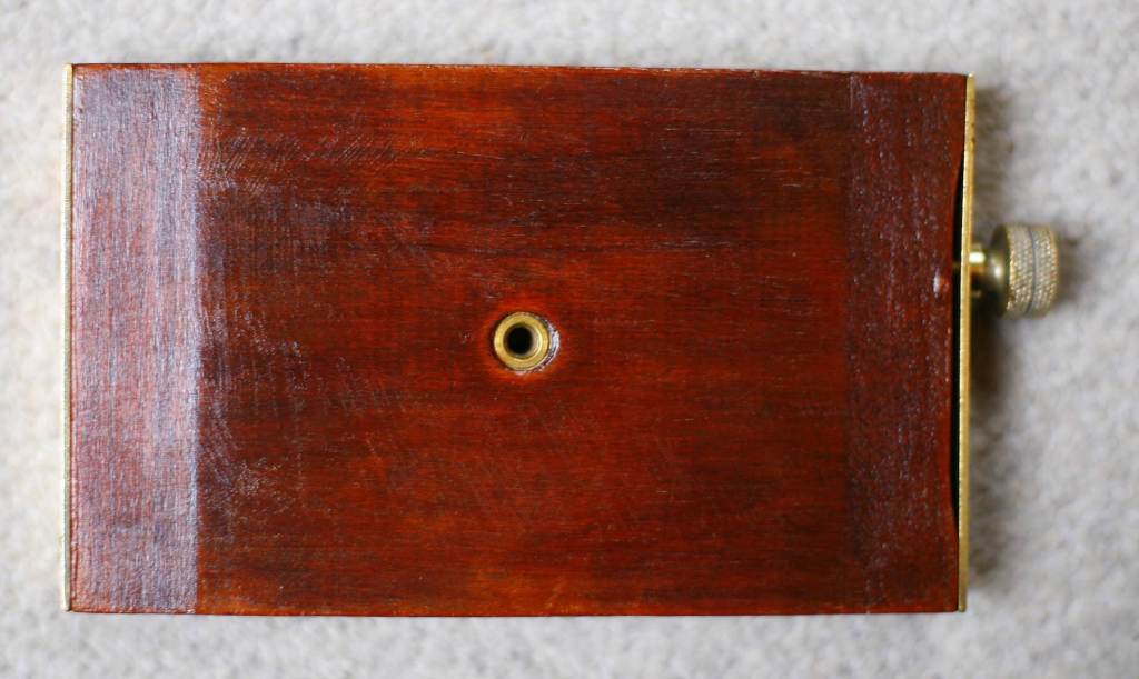 In my last post on my proposed Kodak 2D restoration, I had stripped down the baseplate, as a “test case” to see if my skills were anything like good enough to warrant proceeding any further. I’ve done nothing like this before! Having rubbed the baseplate down as much as I was going to, I tested a couple patches with a “Dark Oak” and “Yew” stain, tester pots purchased from ebay, on a bit of old scrap wood. The Yew was better, so I made the decision to stain the base plate with 2 coats of Yew. It looked OK, the yellow of the Yew tempered the remaining red that was original, and I ended up with a colour that not only could I live with, but actually quite liked. I then applied a coat of quick dry satin varnish, let it dry, did the lightest of rub over with 120 grit sand paper and applied a second coat. I’m happy with the result and am proceeding with that as the plan going forward.