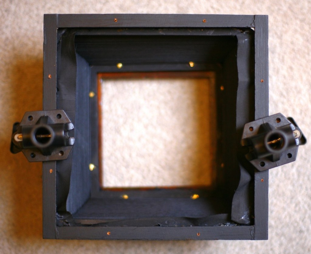 I started with the same procedure at the back, but even with the corners chopped off of the frame, it was a real struggle to get the frame into the bellows. Eventually I did it, without making a hole in them or splitting them! Glued them to the frame. The frame is too small for the camera however, so my plan was to screw this frame to the other that came out of the camera. I’d pre-drilled the new frame and inserted the screws as you can see in the photo below, however trying to screw the two together, from inside the bellows, through the 4 inch hole in the front, proved virtually impossible for me at least. I moved to plan B. I made the holes in the original frame slightly bigger, used the screws more as locating pins. Stuck the two together with Evostick, and from the other side (outside) filled the screw holes with wood filler to grip them in place.