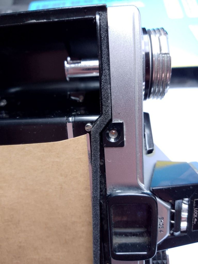 Before I did anything I put some suitable tape over the shutter, being careful not to touch the shutter blind itself. Then as it’s pretty easy to do with the Olympus, I took off the back door. It’s a simple matter of just sliding that screw right by the hinge. You can see from the photo to the right, the state of the foam. It is recommended to remove all the “gunk” with alcohol, I didn’t have any to hand so I used methylated spirits – seemed to work just fine! I used a very small panitbrush to dab on the meths sparingly. Leave a minute, have a scrape, repeat. After about an hour most of the old foam and glue was gone. A final wipe over completed the job.