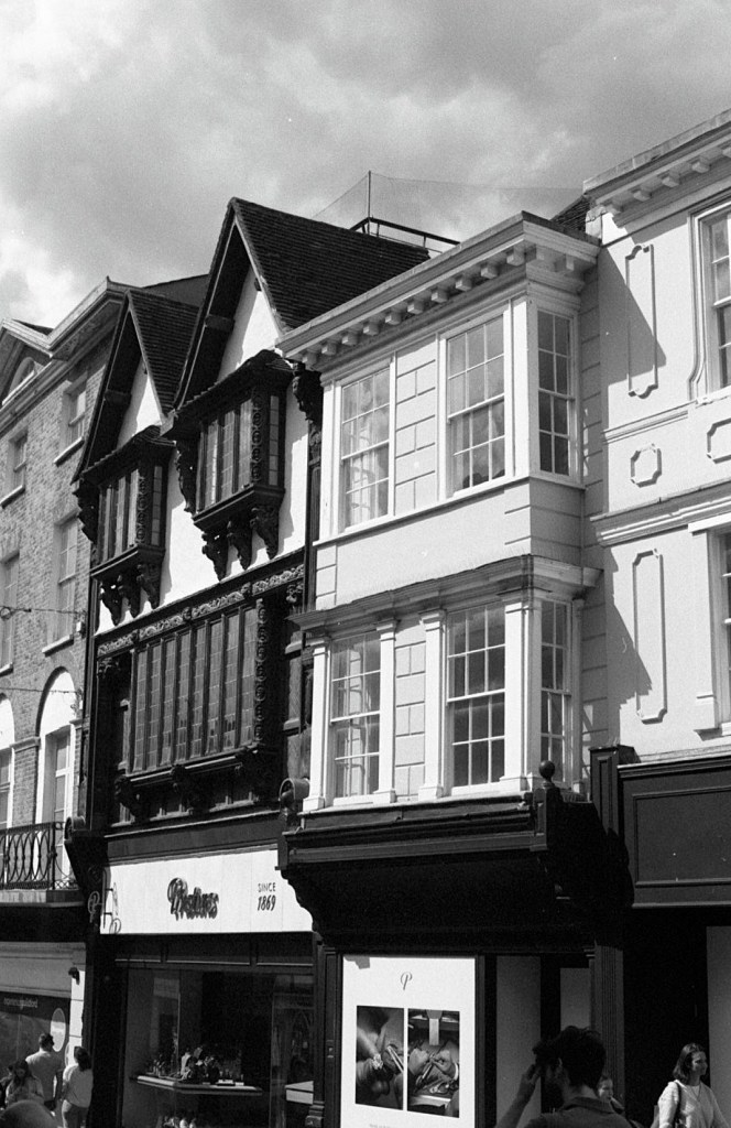 Although it’s not that far from home – and I’ve been there twice that I can remember, both my past visits to Guildford were tied up with film festivals. I’ve seen the same car park, stage door, and theatre interior twice, and nothing else of the town! It’s one of those places that is out of the way, so I’m never going to or past and it’s taken until now for me to re-visit! The high street rises from the river, and near the “low end” is the statue of “‘The Surrey Scholar’ (above). It was commissioned by the University of Surrey to mark the millennium and is by Allan Sly. A little further up typical historic buildings, below.