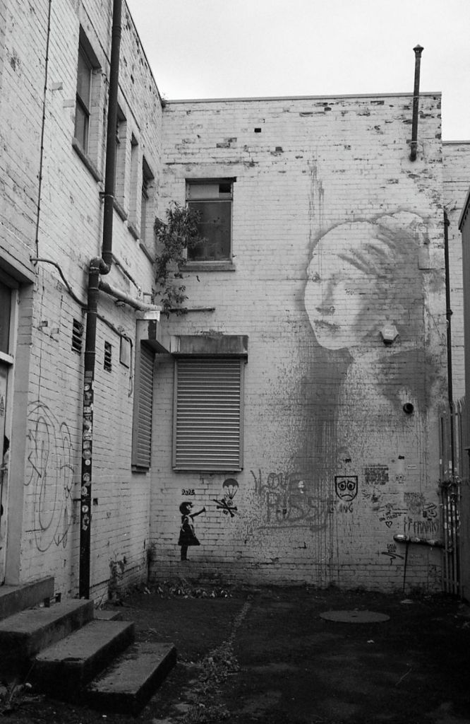 Banksy may or may not be Robin Gunningham, the latter was a student of Bristol Cathedral School, approximately 110 meters away from this “Banksy” “You Don’t Need Planning Permission to Build Castles in the Sky” (above). Just the other side of the river (600 meters away) is Banksy’s “The Girl With Pearl Earring” or I guess should be “Banksy’s The Girl With the ADT Alarm Box”. 🙂
