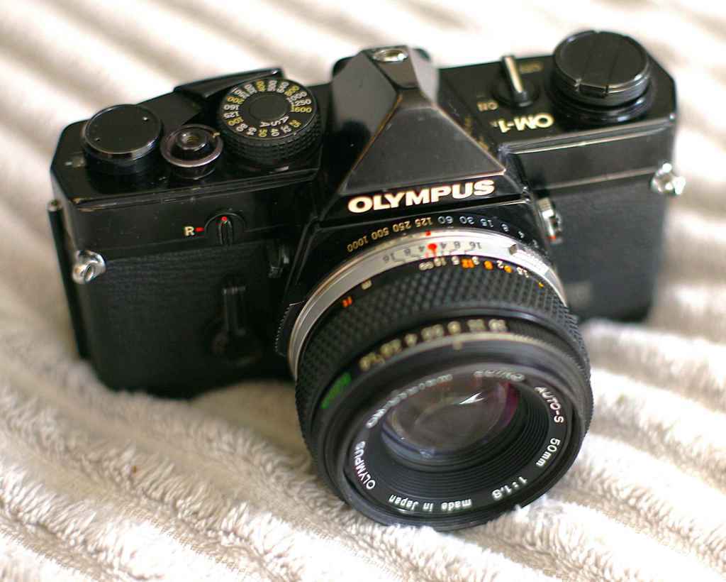 Olympus made an M1 SLR in 1972, it was designed by the legendary Olympus designer Yoshihisa Maitani. He gave the company the many of it’s famous designs over the years. Because Leica had a line of “M” cameras they complained at it’s name, and so it was changed to the OM1 (1973). It was followed by the OM1MD in 1974 and finally the OM1n in 1979. As you can see from the image above it’s not a fussy design. On top is the film speed dial, shutter release, wind on and on/off lever (for the meter) and the rewind crank- that’s it. The shutter speeds are selected around the base of the lens, not that un-usual in those days, think of the Nikon FT’s. Aperture is around the front of the lens.
