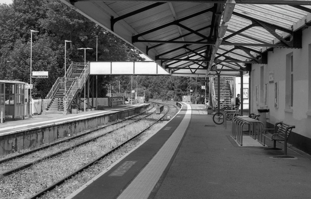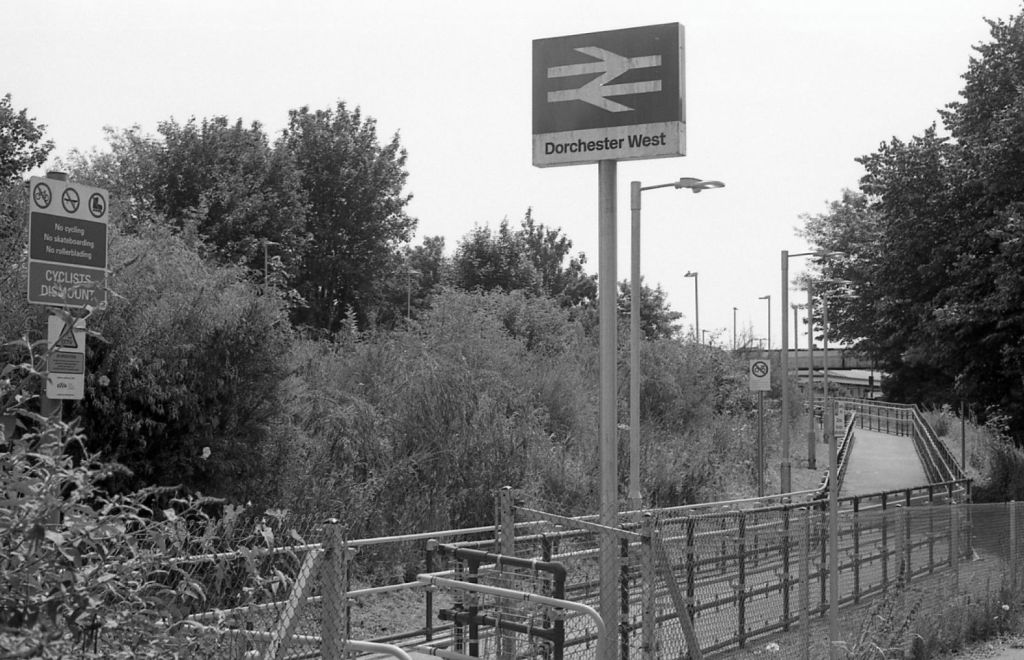 I had a quick lunchtime photo walk with the Olympus OM1n the other day. This time I finished up half a roll of Delta 100 in it. The 50mm f1.8 is as good was as good as ever. I walked on the opposite direction to my normal route and therefore took it a few streets I haven’t seen for a while. The first surprise was that there is a whole new entrance to Dorchester West railway station. There are two stations – the other is Dorchester South! The new entrance (below) at “West” is so much better. For a start it allows a direct route to and from the hospital, not only that but it’s a ramp so for wheelchairs, prams, bikes (being pushed) it easy. It avoids a very narrow pavement under a tunnel.
