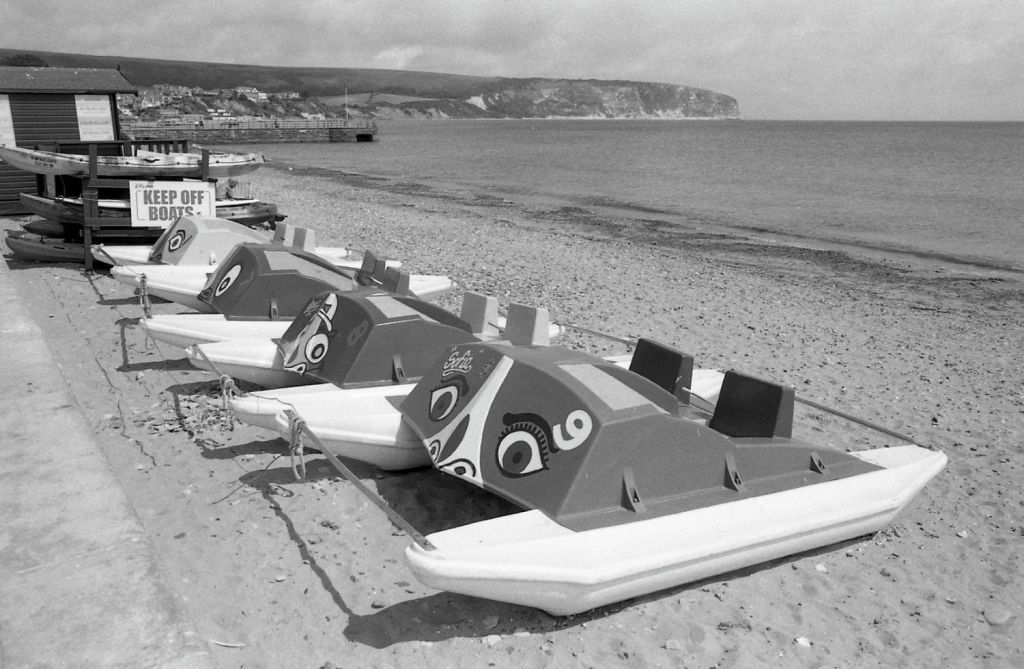After arriving in Swanage by steam train, it was just a short walk down the main street to reach the seafront. It was a hot day, so first I had an ice cream – double chocolate, very nice! A little further along is this group of rather smart beach huts, you may recognise them from the colour version on my homepage, (about time I changed that!).