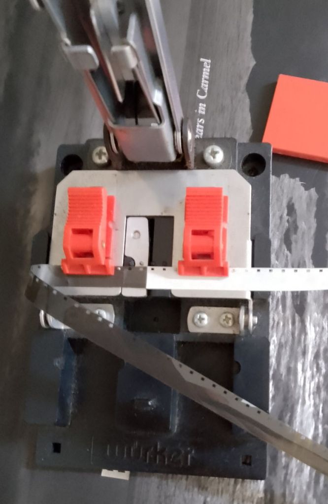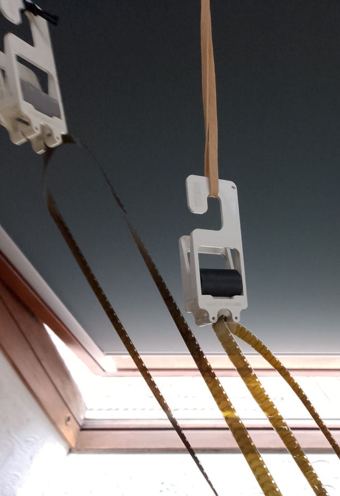 To my surprise I had an image. Of course developing a colour K14 process film in black and white chemistry is never going to be good, however an image is better than none. The next fun job was to untangle a 50ft length of wet 8mm film. That’s another half an hour of my life I won’t get back! The drying was fun too – one side of the room to the other, plenty of “how long is that going to be there?” questions. Luckily it was a very warm day and it dried quickly. I had a root about in my archive and managed to find a length of white leader, another of my “that will come in useful one day” stock pile.