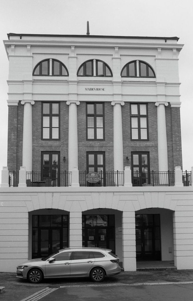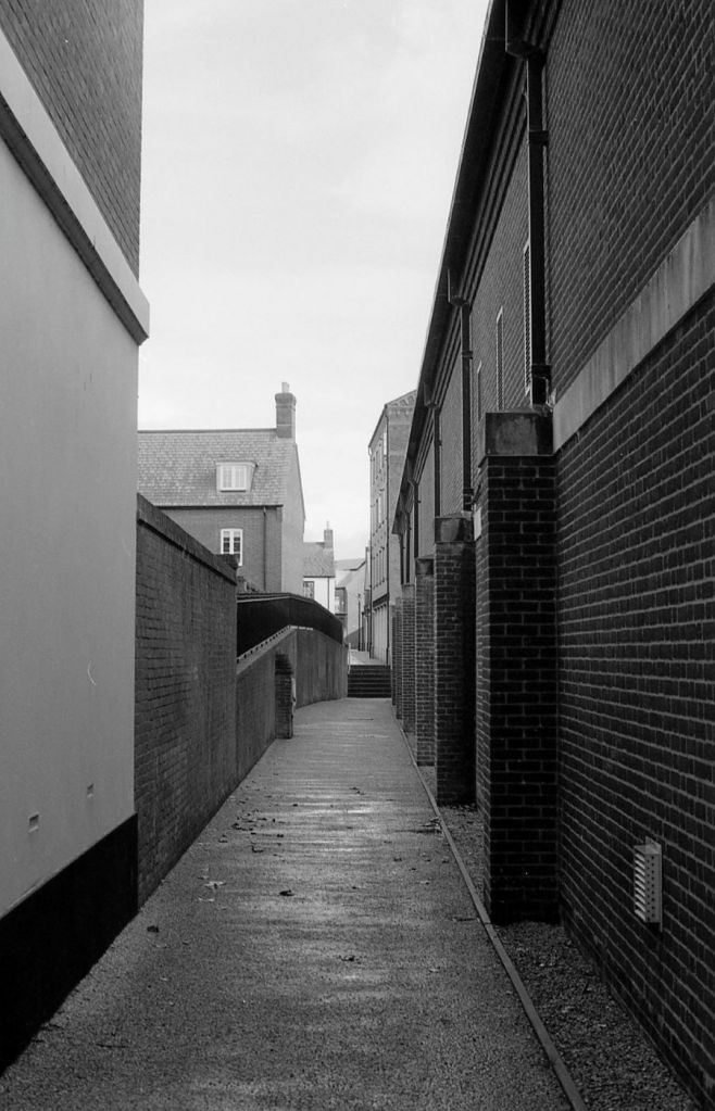 Last month I had to do “the hospital run” to Dorchester Hospital. This leaves 4 or 5 hours for me to wander about before getting back to the hospital for a pick up! The hospital is on the eastern edge of Dorchester, and a little further east again, Dorchester runs into King Charles’ Poundbury, in the sort of way that you can’t tell where one ends and one begins. Rather that would be the case if there wasn’t an “odd feel” to Poundbury. It always feels to me like a studio back lot somewhere, something not quite real or “right” about the place. Part of that is that the entire place is new, and since my first visit, that is better, things, stuff are starting to grow into place. The other part is that it is so quiet, as a visitor you hardly see anyone! My Olympus OM2n was with me, so here is a first selection of the architecture. No people as there weren’t any – literally!!
