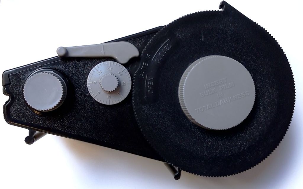 My bulk loader above, once it’s closed and ready to load film, clicks with every turn for every exposure. 40 clicks gives me a 36 exp film with a bit for a leader. But who said you have to use 36? I recently decided to load up a 18 exp roll for use in my half frame Olympus EE3, yup a 36 for half frame. I knew I wouldn’t need 72! IF I’m testing a camera I can load up a 8 or a 10. If I want to photograph something with a few shots and develop it quickly I can load any length I want. At the other end of the scale there are magazines for certain cameras that take 50ft runs, so you can shoot for longer without stopping.. loading it onto a Paterson reel? I wish you luck! 🙂