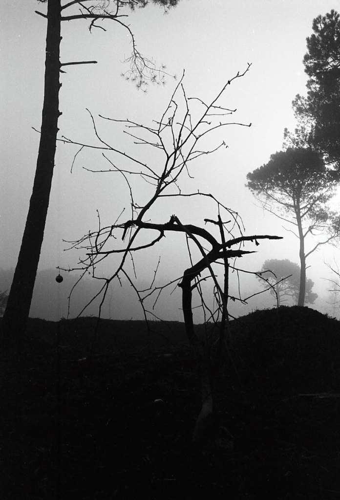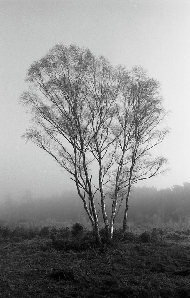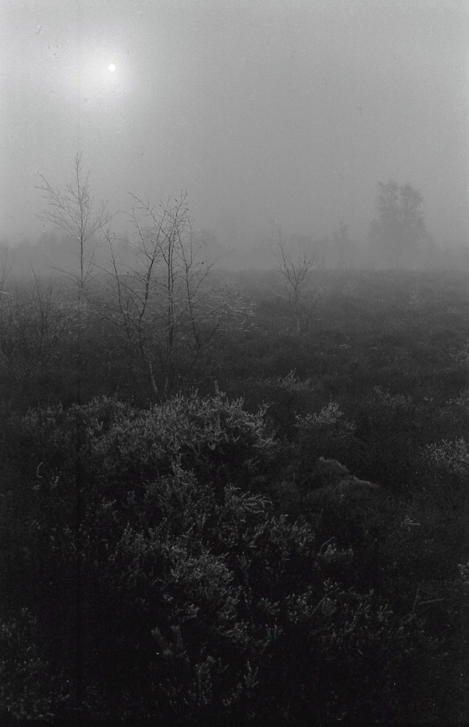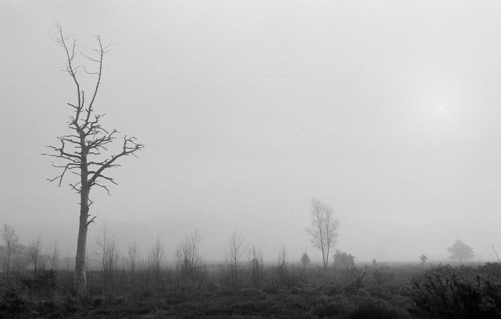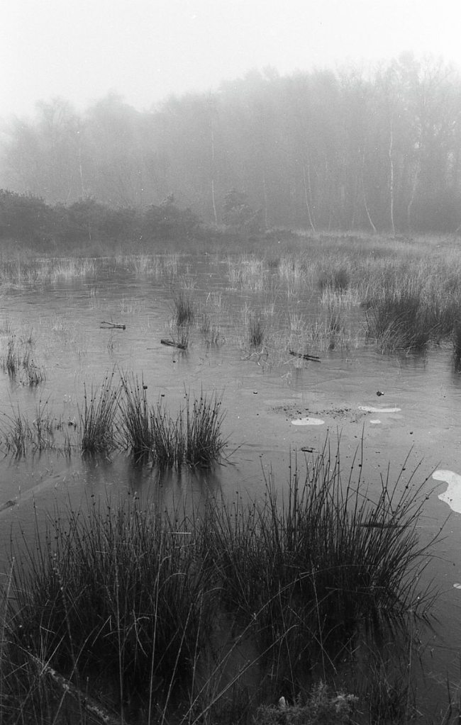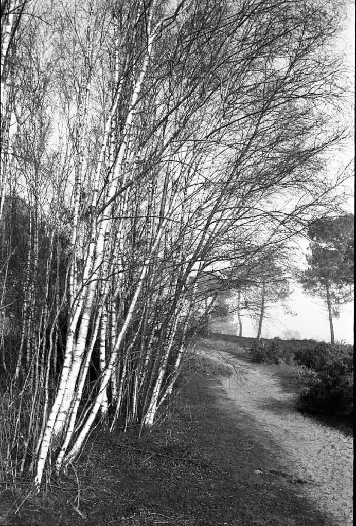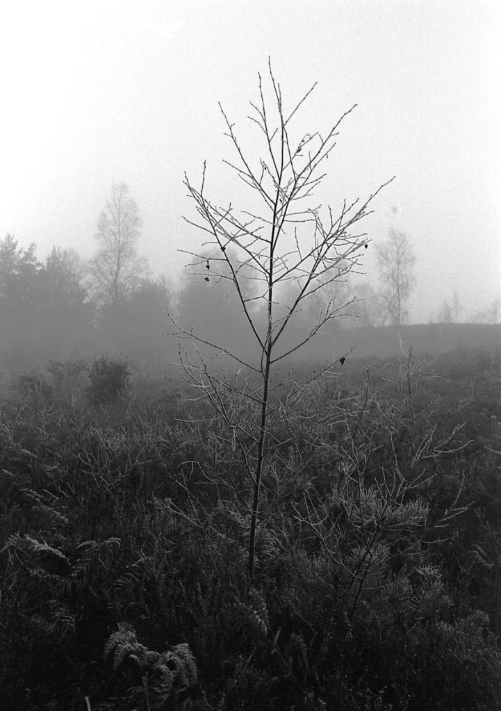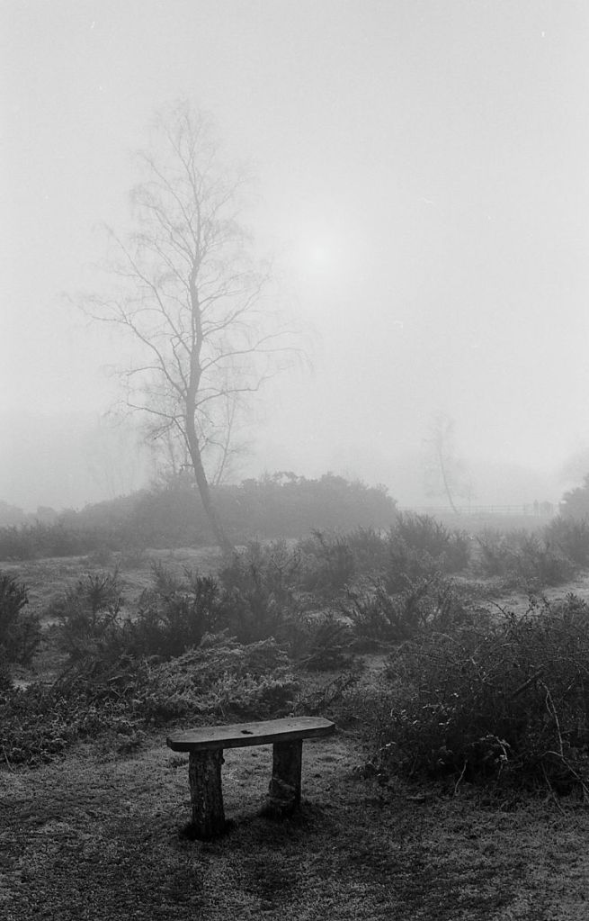 The last day of 2025 was cold and icy, but with a clear sky, so I decided I would move myself, and get out for a walk. I went to the Avon Valley Country Park. It’s nearby, and easy. It’s quite a wet, heathland area, and as I pulled into the car park, I entered a land of slightly mystical, hoar frost, mist and ice. I had taken with me my Olympus OM2n, the 35mm Zukio lens, and had loaded the camera with a roll of Ilford Delta 100. I also took along the 50mm lens but never used it. All told I walked for about and hour and a half. It was cold for sure, but I’d wrapped up warm so that was no problem, but every breath was a bit sharp on the chest!