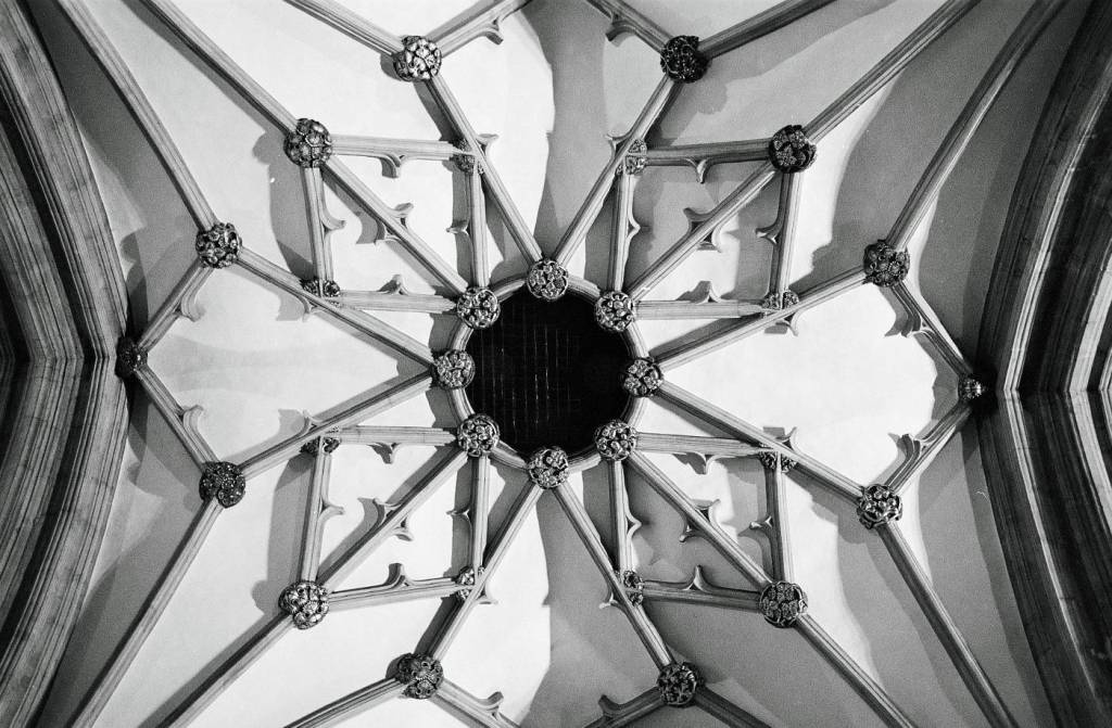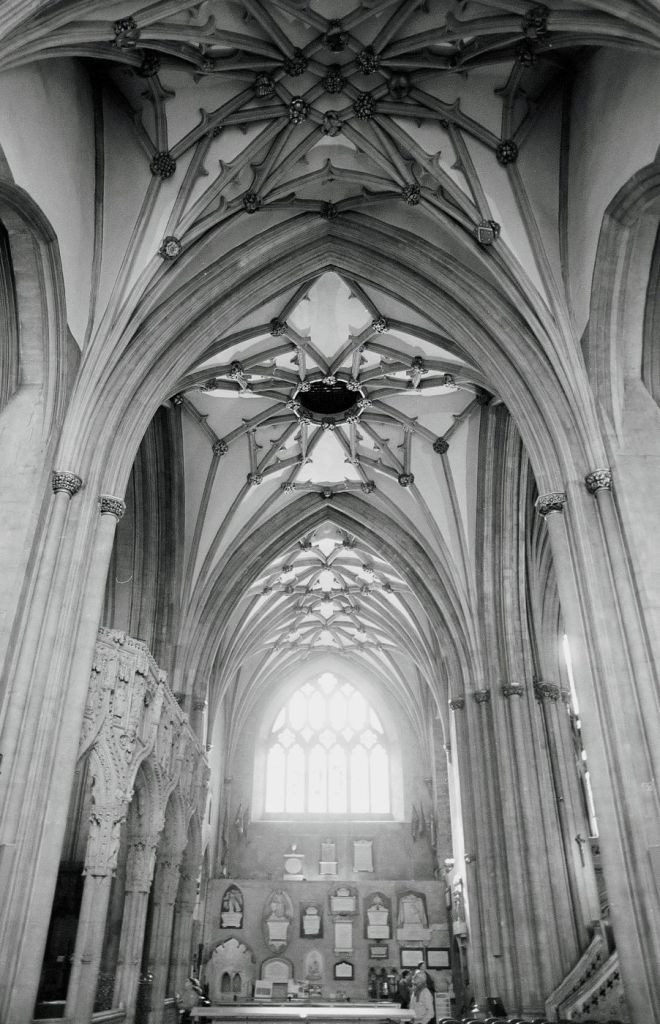 Bristol Cathedral stared out life as an Abbey and monastery founded in 1140. Over time bits were added right up until the two west towers were completed in 1888. Longer time viewers of this blog may well remember that I am doing a long time project, in no particular hurry, photographing all 42 of the Church of Englands, Anglican Cathedrals. This I am doing on film, Ilfords XP2 to be specific, chosen because it’s 400 speed is about right for most situations, and it’s made in England. Not that I am at all nationalistic, it just seemed a sensible choice. It also happened that without much thought, the first two I photographed were on that film!