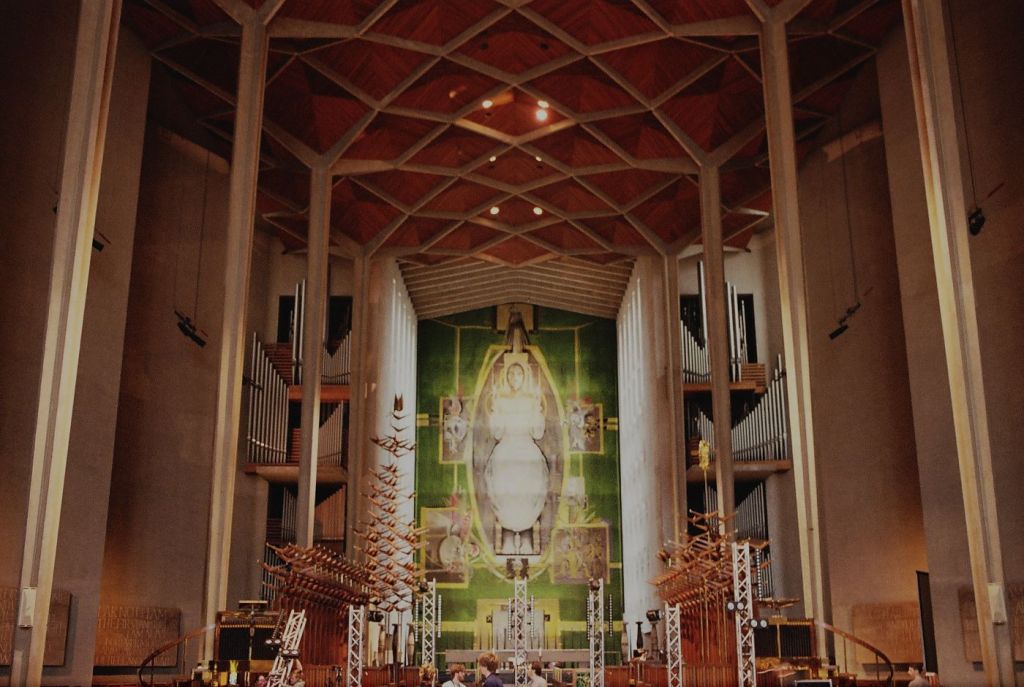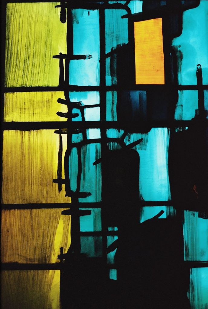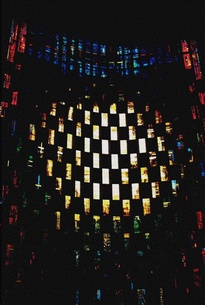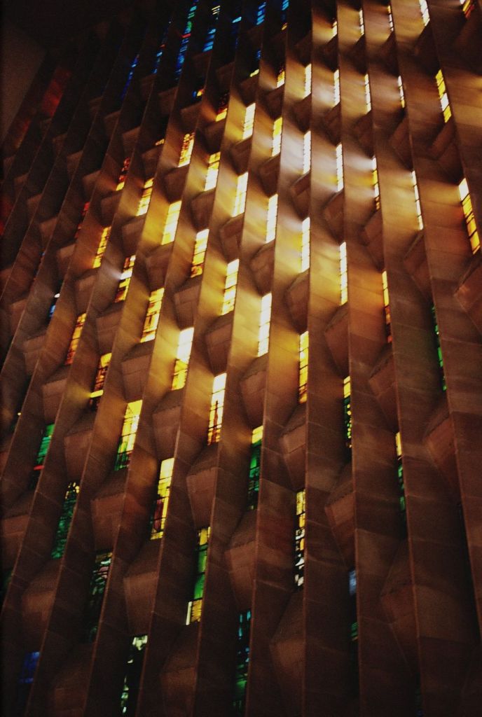 The main reason for using colour here was the stained glass. Neither the photo on the left or middle above do justice to the overall effect, which is rather like looking at a cross between the sun and a rainbow. Neither do the photo’s capture the scale, for that matter the first photo doesn’t convey that Graham Sutherland’s (green coloured) tapestry is a whopping 12×23 meters!